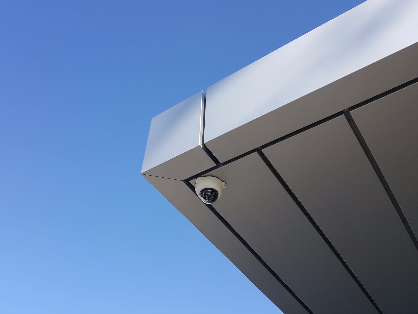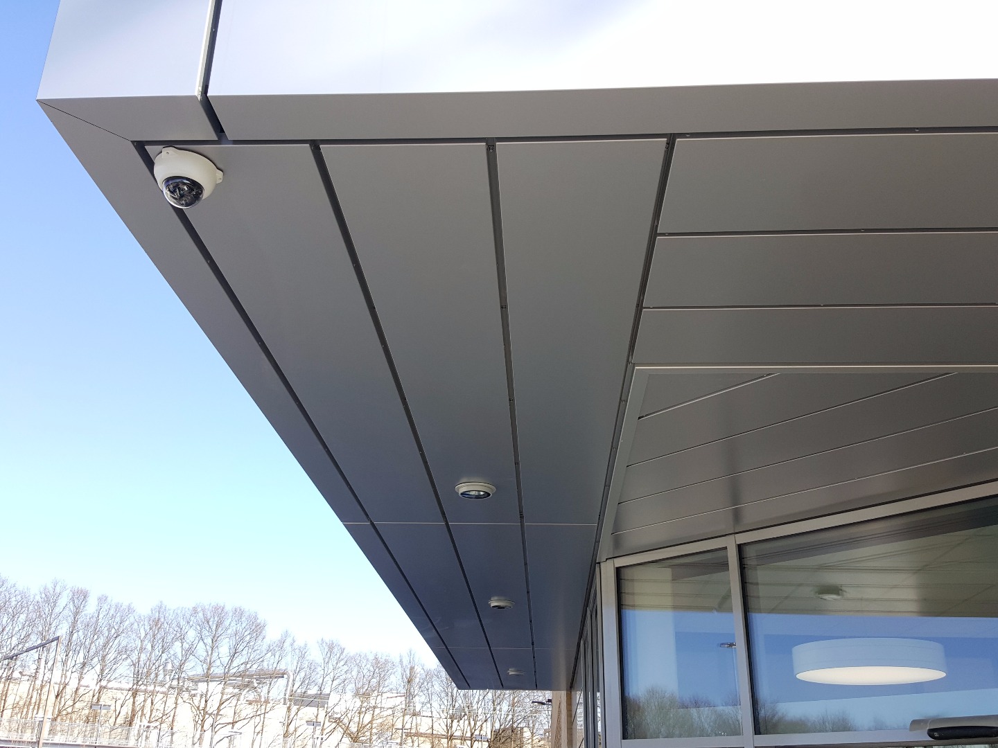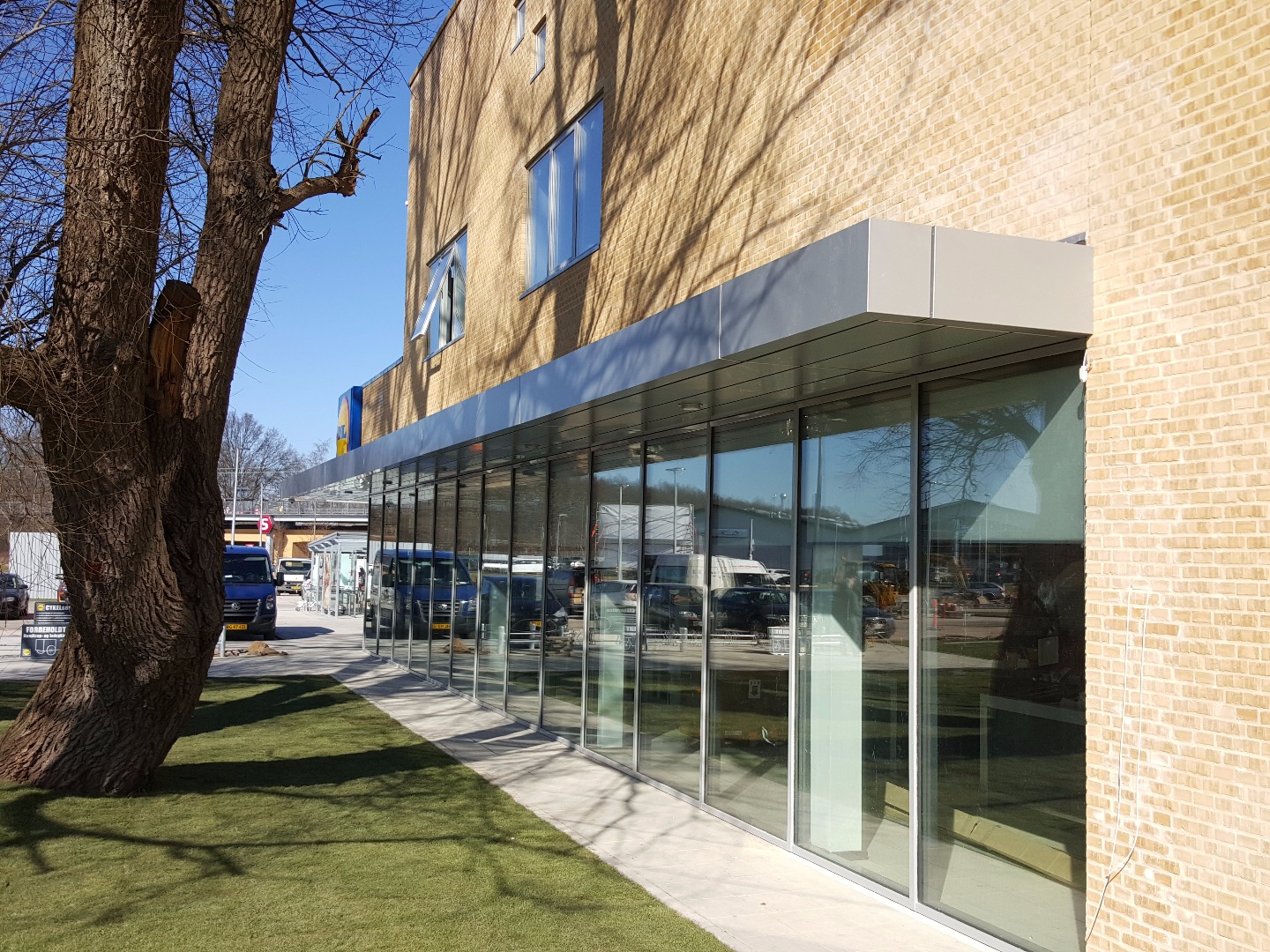 Isolerende buitenbekleding op de wand en plafond rond de ingang en vensters van de winkel met Alucobond cassettes in de kleur Silvermetallic 500.