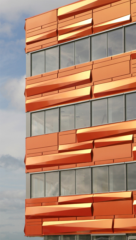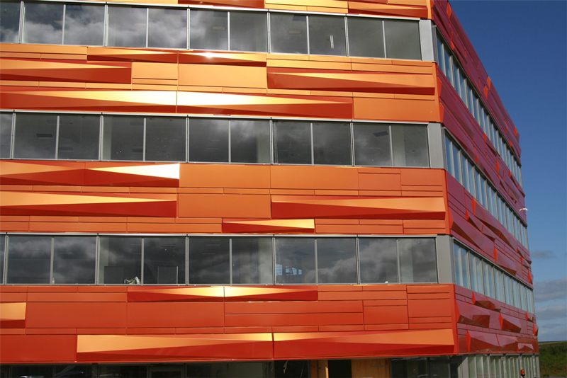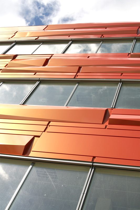 De gevel is bekleed met Alucobond isolerende platen in Spectra kleur, die van kleur veranderen, afhankelijk vanaf welke hoek u op het gebouw kijkt.